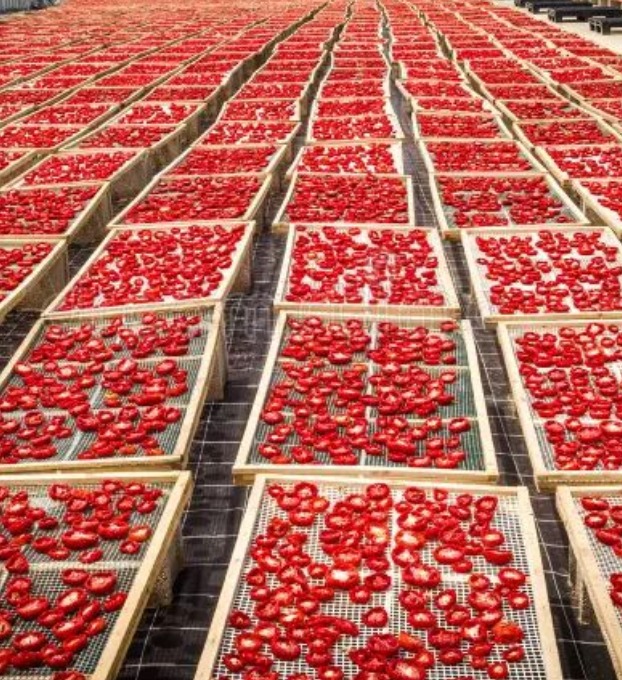 Après séchage, les tomates sont triées manuellement, emballées sous atmosphère sèche et scellées pour le transport